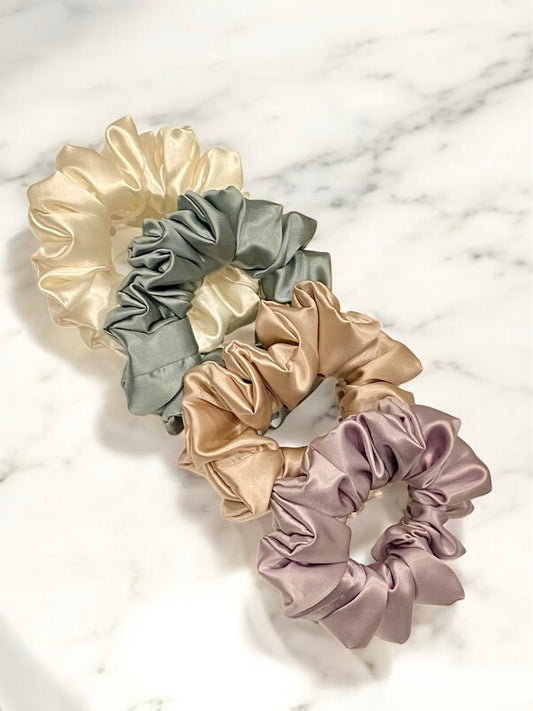Explore our collection of beautiful satin scrunchies in rich colours and multiple sizes. Soft, silky, and luxurious to the touch.