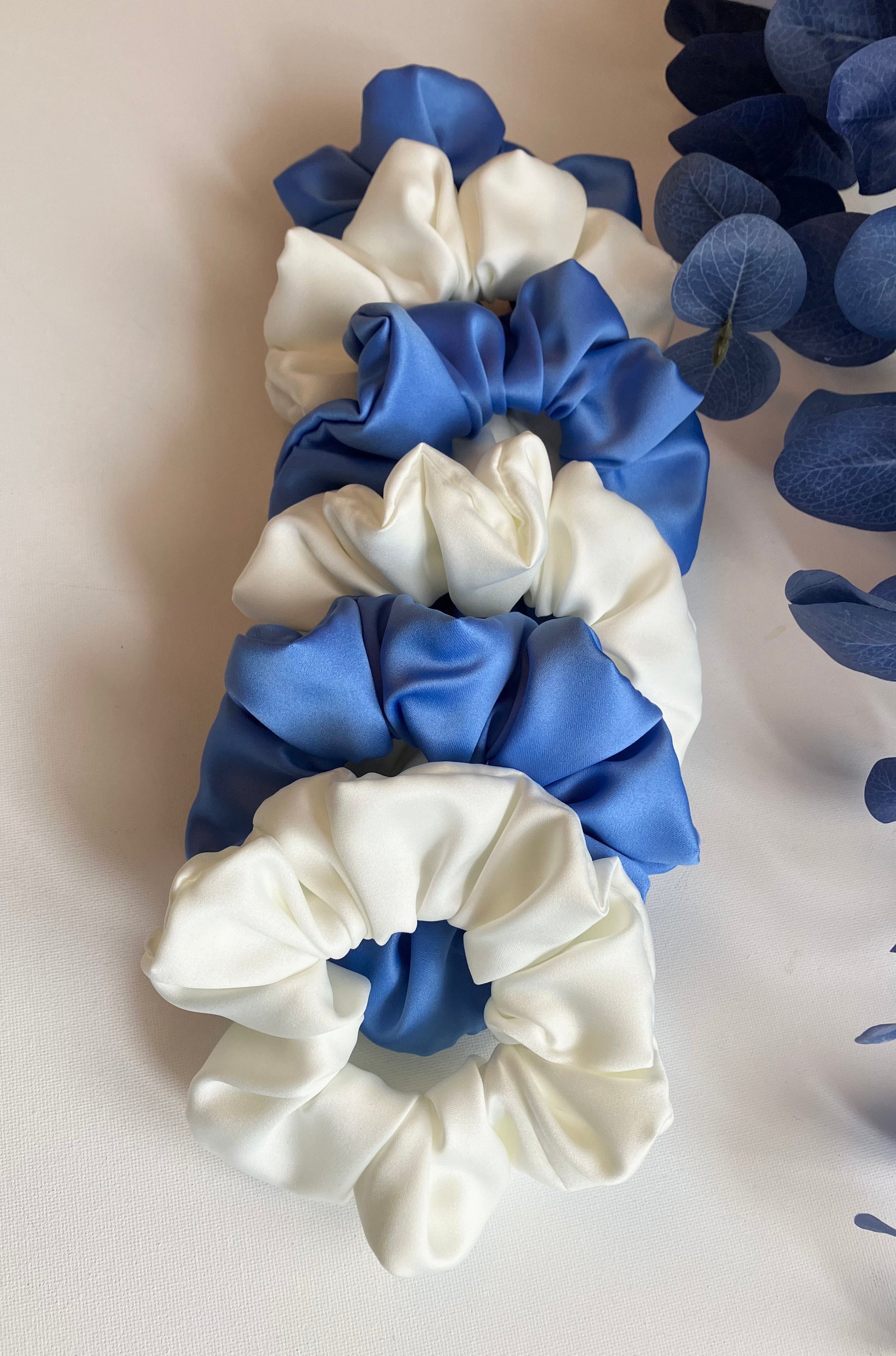 Get playful with The Satin Scrunchie! These large scrunchies are made from beautiful, soft satin fabric in cream and blue colours. Bring some style and comfort to your hair game with these quirky additions.